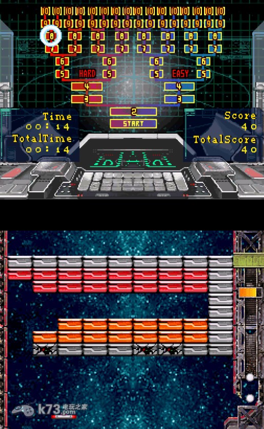 本作是一款非常休闲的游戏,玩法类似于早期的乒乓球游戏,玩家需要控制下方的横板保证球不会掉下去,直到将全部的障碍物打完才算通过。