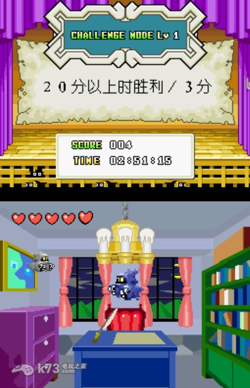 本作是一款非常休闲的游戏,游戏的玩法类似于砸地鼠之类的小游戏,玩家利用nds的下屏将出现在屏幕上的敌人点击下即可。游戏分为挑战模式、自由对战以及VS模式,联机游戏让这款非常有乐趣。