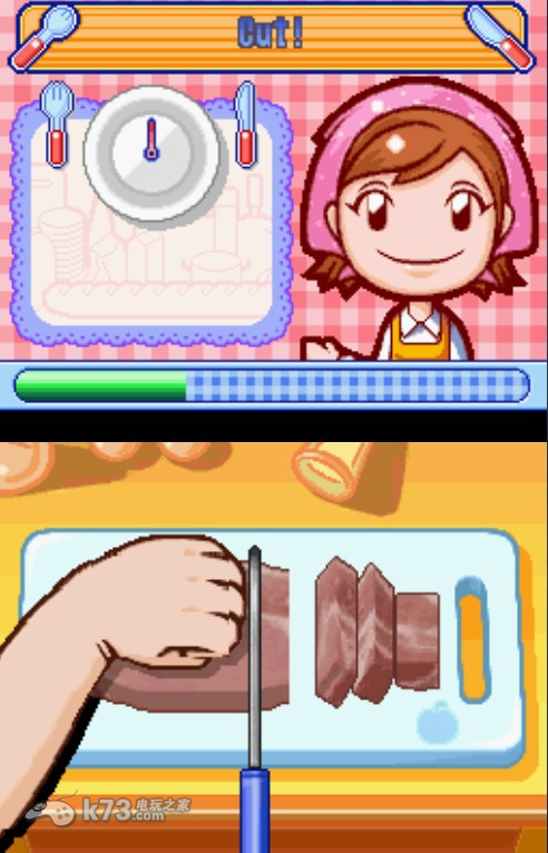 本作是nds平台上知名的游戏系列作品《料理妈妈》的首款作品,游戏是一款灵活利用nds下屏触摸功能的创意游戏。游戏中玩家需要扮演妈妈制作各位美味的料理,如切肉、搅拌等日常生活中需要的一些做菜步骤在游戏中完美的还原,游戏的临场感十足,喜欢这一类型游戏的妹子们可不要错过哟!