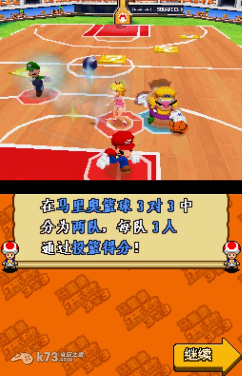 本作是任天堂旗下在nds平台上推出一款多人同乐类型的游戏,游戏的主题为篮球,玩家需要控制马里奥、路易、碧奇公主、库巴等角色进行3 VS 3的篮球比赛对决。游戏相当的欢乐,绝对是喜欢篮球和休闲类玩家必玩的作品。