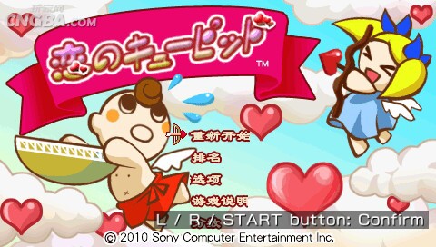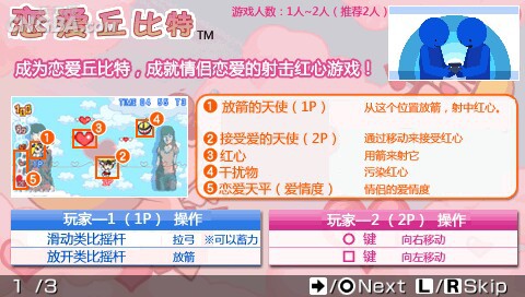 支持2人同时使用一台PSP共同配合游戏。1P控制妹子丘比特射出爱情之箭,2P控制汉子丘比特负责用托盘接住妹子射下来的爱心。要小心天上飞舞的恶魔哦!