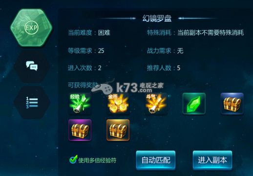 在接下来,当我们的等级到达35级后,还有两次机会“幻境罗盘”副本。推荐大家,进入时选择“自动匹配”或者提前与好友组队,推荐组队人数为3人,且组队的玩家等级要跟自己的等级差距控制在3级左右。这样可以增加罗盘的次数,需要注意的时,进入前一定要使用多倍经验符,这样可以最大限度获得大量经验值。