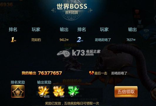 5.Boss死亡后会根据玩家对boss的伤害情况给每个参与活动的玩家基础奖励,并按照全服玩家的输出排行发放排行的宝箱奖励。
