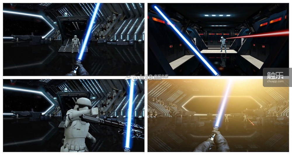 经过一段时间的校准,你的手机将变成光剑的剑柄。双手握持手机的你,就好比《星球大战》电影中拿着光剑平砍的绝地大师。与电影里握持光剑的姿势一样,当你把手机移动到一侧,做测斜动作时,便能格挡子弹;如果你拿着手机摇晃,还能平砍暴风兵。游戏的前半段主要靠反弹子弹消灭敌人,后半段需要靠闪避和平砍消灭敌人。由于联动可能会出现延迟,很容易死,所以想要完美通关还是有点难度的。