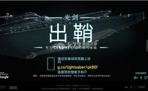 《光剑出鞘(Lightsaber:Eacape)》是Google为星战迷推出的一款手机和pc版的联动游戏,玩家在手机和pc上同时进入指定页面后就能把手机当做光剑进行战斗,下面带来光剑出鞘玩法介绍。
