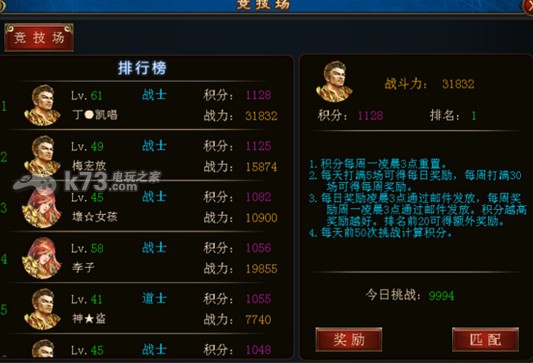 1. 当玩家等级达到25级的时候,就可以去更多玩法中竞技场时展现自己的实力了,系统会根据战力自动匹配合适的对手,进行竞技PK。获胜的人能 获得积分,系统按照积分排名,每天参与5场就能获得参与奖,排名靠前还有丰厚大奖,不过积分会在每个周一3点重置,玩家自己要安排好时间哦。