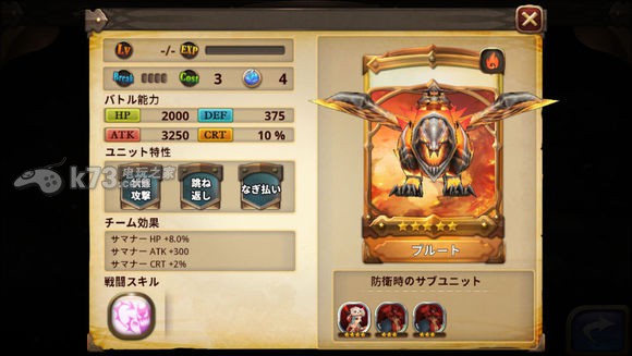 这只被动挺好,hp+atk+crt,本身是火属,召唤用的话是用来攻略地灵的好手,技能方面是反伤,主角够硬时挺有用,但这只放队的话主要还是为了被动,中规中矩的角色。