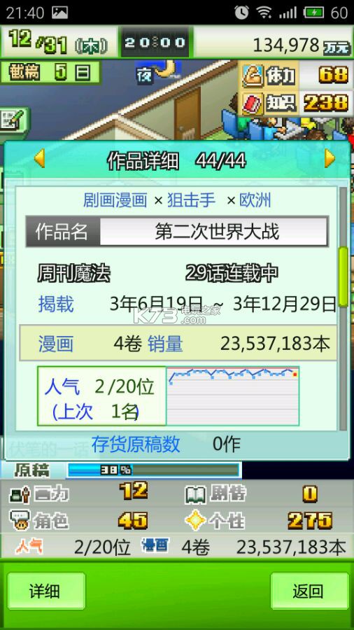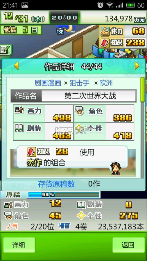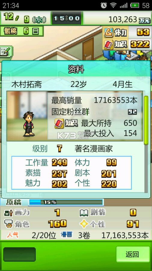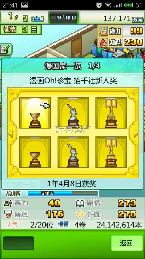 画好第一个作品后去第一个出版社自荐,对方要是不采纳就重新开档游戏,只要采纳了基本都能得新人奖。得奖后花300万搬家,可以放家具了,先用送的家具和奖杯将就一下。把经验值全部用来提升工作量,在第一个出版社混到工作量100左右,再适量的增加个性和魅力属性。至于画力和剧本完全不用管,全靠家具提升。