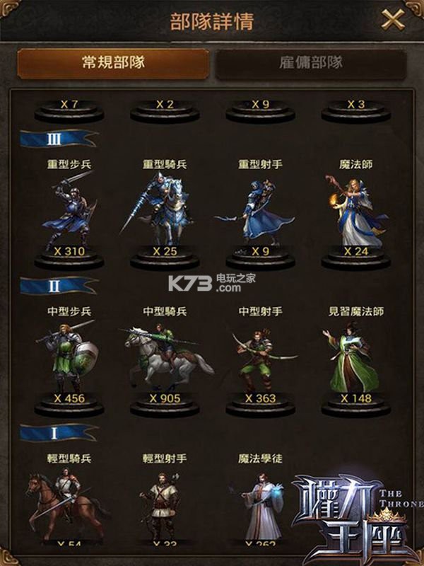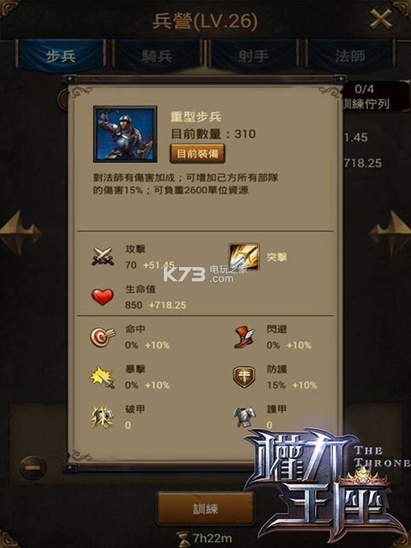 从以上表格,我们可以清楚的看道,每一个兵种在不同阶级时,所产生的攻击力、生命值及负重量的变化。而且,更有趣的是,每个兵种在不同阶级时的优势都会有所不同喔!像以攻击力来说,一阶骑兵>一阶射手>一阶步兵>一阶法师,但是到了二阶的时候,则是骑>射>法>步啰!所以我们每一次出征,都要清楚知道战斗的目的以及对方的兵力,以便将阵容最佳化喔!