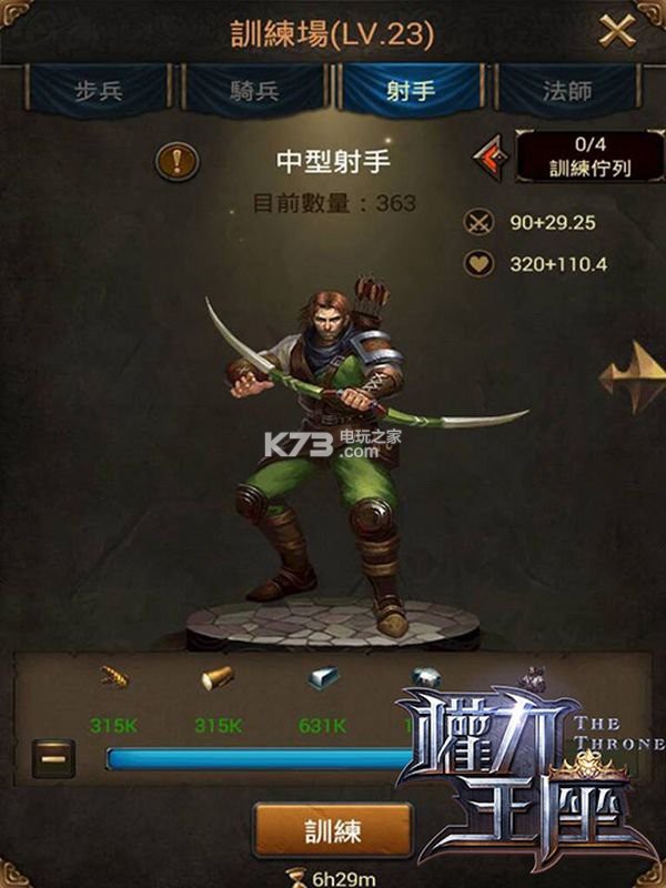 想要培养出最强战力的部队,那不能不对游戏中的兵种有所了解,游戏中的兵种共分四大类,分别是步兵、骑兵、射手、法师,而每一种兵种还可以分成五个阶级,阶级越高的兵种战力自然就越强啰!一开始我们只能生产轻型步兵,随着兵营的等级提高,慢慢的我们可以开始生产轻型骑兵、轻型射手及见习魔法师了。注意,当你还无法生产四种部队时,切忌,先不要随便的在大地图上开战喔!因为这牵涉到兵种相剋以及阵型的问题。