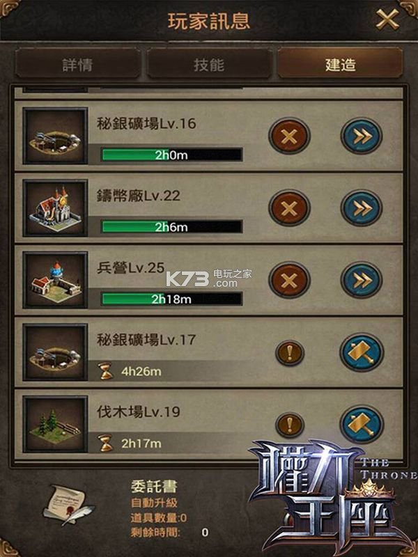 建筑物的升级安排,只有方向策略,没有一定的顺序。我们是以进攻为诉求的话,基本上除了城堡等级要尽快衝高之外,再来就是兵营、学院的等级,最后是仓库及各个资源地。当我们可以建立第二个兵营,同时还拥有训练场时,除了两个兵营生兵效率佳之外,还可以利用训练场把一阶军队进阶,让战力能更有效的提升。也许有些熟悉战争策略类型的玩家看到这裡,会产生怀疑:没先提高资源地的等级,那资源不足时该如何生兵、盖建筑?这在一开始时有提到,这部份只有策略,没有一定顺序,兵营几级时该回头升级资源,这全看每个玩家可运用的「银弹」多寡而定。