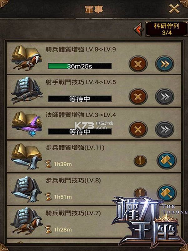 有玩过SLG这一类游戏的玩家都知道,一支军队是否称得上强大,除了军队本身的等级之外,科技的辅助加成,也是相当重要的,这也是为什么在建筑顺序上会把学院视为和兵营同样重要的塬因。当我们一边在发展建筑的同时,可别忘了还可以利用学院来研究科技,当然我们是以军事类别的科技为优先,这裡的分类很简单,就是提升四大兵种的攻击力和生命值。基本上就尽可能的平均发展,不要出现某个兵种特强、某个兵种特烂就行了。另外,虽然建设类别的科技不是我们发展的首要,但在这裡面有两个科技还是跟军事有关,就是战斗经验及寻路术。想要角色等级升级快一点、不希望部队在大地图上龟速移动,这两个科技还是要花点时间照顾一下喔!