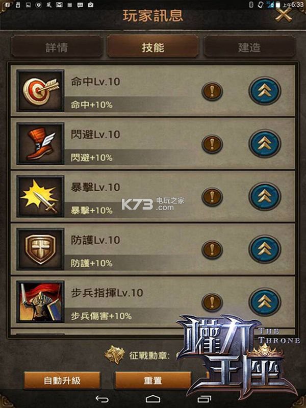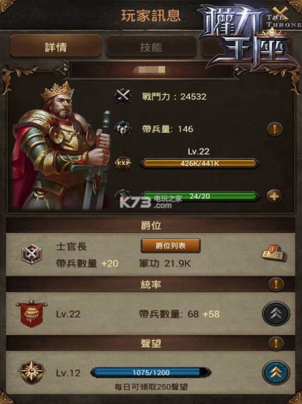 除了了解兵种的能力值、升级建筑、发展科技之外,君主本身也是要对部队战斗力做出一些贡献呀!在君主介面中,我们可以看到叁个页面,第一个页面「详情」,在这裡我们可以看到目前的带兵量,带兵量越多战力自然就越高,而提升带兵量则是需要统率和爵位。统率比较简单,只要有足够的统率书就可以升级了;而爵位就比较麻烦一些,它必须要拥有足够的军功才行,而军功又是要消灭敌人才行,所以初期可能累积较不易,但保守估计开服七天之后,世界地图上将会战成一片,这时候军功累积就会很快了。