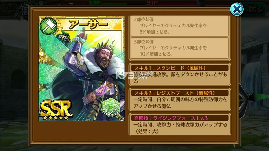 召唤技:一定时间我方全员"攻击"、"特攻"增加 100% Lv3