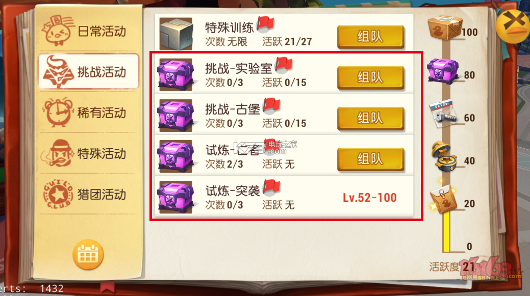 挑战系列的活动虽然也产出不菲的经验,但是由于其具有一定的门槛、需要一定的团队配合,老猎人一般追求的是其产出的各种升级、强化用的高级材料如秘宝金属块、遗迹金属块等(还有可能掉落神器),来提升自身角色。猎人们可以通过前面提到的活动提升自身的实力、磨炼技巧再去挑战。
