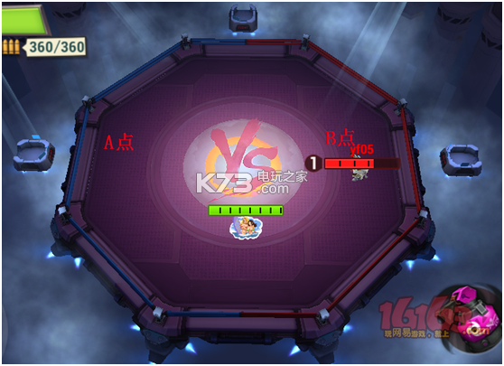 A/B点分别是敌我双方的出生点、复活点,且回到己方所在点位时血量会迅速恢复。中央的白色区域内是双方争夺的区域,当处于争夺区域内的一方人数较多时,人数多的一方进度将会上涨: