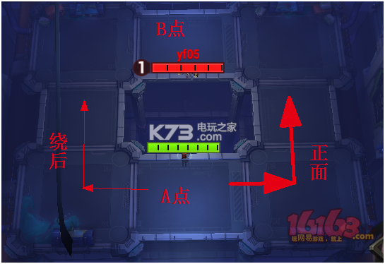 可以看到环形场地是一个对称的场地,其中A点是己方出生点,B点是敌方出生点。明显此场地是一个首尾相接的场地,一个好的远程可以有几乎无穷的空间去风筝近战。因此,此场地的最好打法是队伍主力从一路和敌方刚正面,分出一个哈利或者查尔斯从另外一条路摸到敌方后面切他们的后排,打乱敌方的节奏。