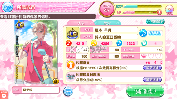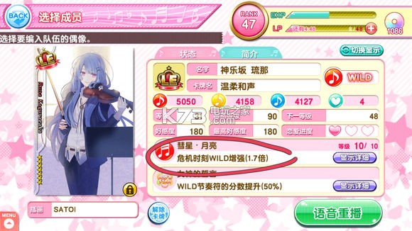 使用方式:歌曲开头故意miss掉血,低于50%(升级技能后可能只需要66%左右)后触发技能,然后正常地打完一首歌。