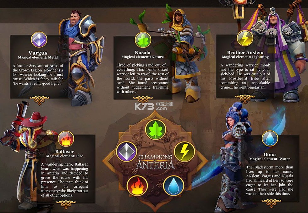 。首先是5位英雄,依次是剑士(持剑和盾)、游侠(持弓)、德鲁伊教徒(持杖)、火枪手(持枪)、女战士(持双头弯刀),分别对应金属、自然、闪电、火、水五种元素。