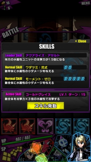 补充最下方主动技能说明:右边有个ターン(Turn)数,在地图上走一步算1turn,在战斗中有攻击也算1turn...剩多少才能发动就自己看啦,所以地图多绕几格再打王吧XD