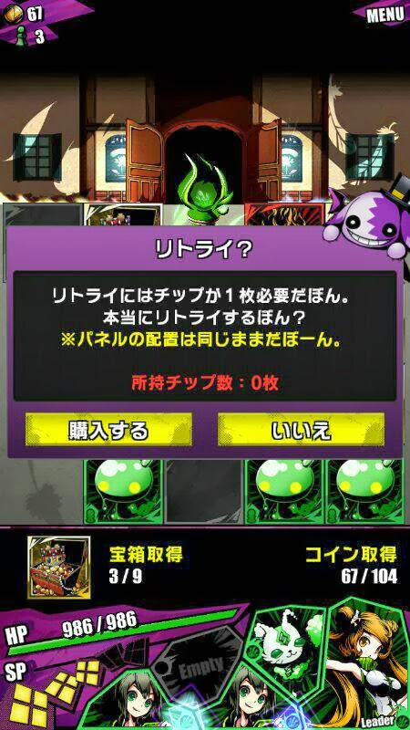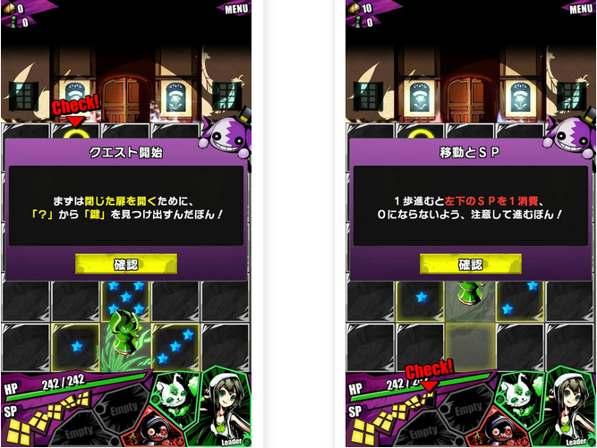 进入大门后,便会算攻略了一层,而所有报酬或怪物均会公开。玩家可以选择花一个「チップ」(即PAD中的魔法石)重新走一次迷宫,由于格子是公开的关係,所以可以自己选择要什么。这个系列恐怕是用作日后一些Event关卡中,玩家寻找乱入怪物的课金方法(真会营运)。