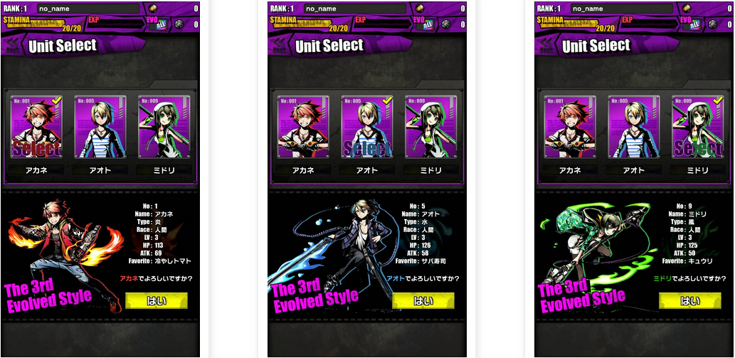 安装好后,便可开始游戏,首次登入要花点时间读取。玩家会首先从叁名主角中选择一位。随便从心就可以了,分别不太大。队长技能都是自身相应属性的单位攻击力1.5倍。火属男角是叁位中攻击力最高,水属剑男则是血量最高。