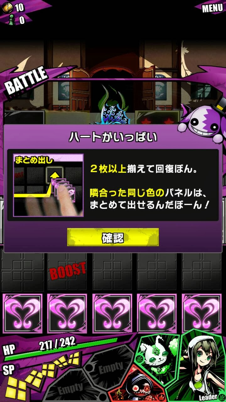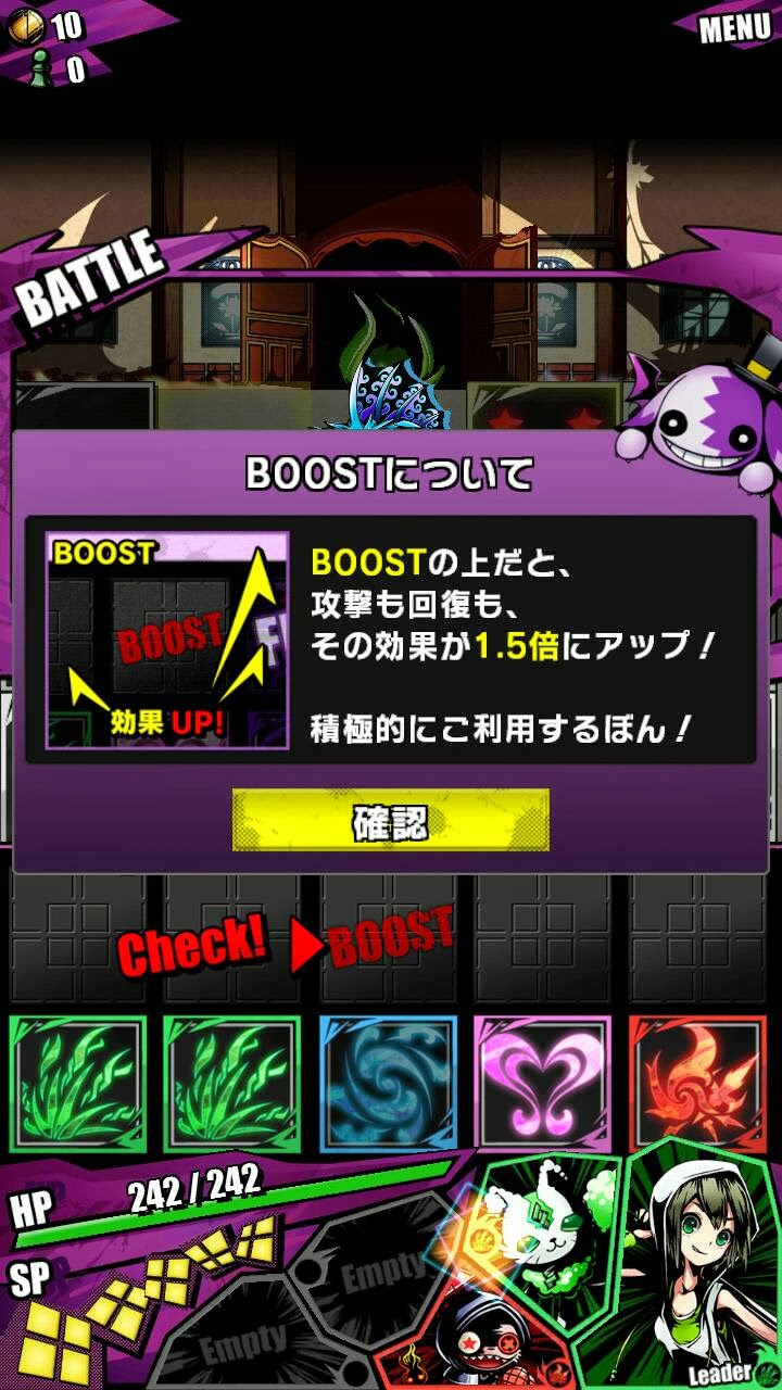 有「BOOST」字眼的空格会将该格的攻击或回復变成1.5倍效果,配合队长技等加成,可以变得好可怕。玩家遇上此等格子时,不妨先把没有用的方块移到一侧,把同色的方块移在一起,由于未放入第一个方块于格子内,时计不会起动。把它们排好后,有利自己5秒内顺手地配置,提高效率。