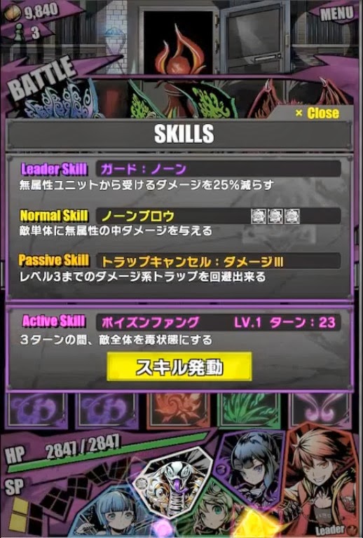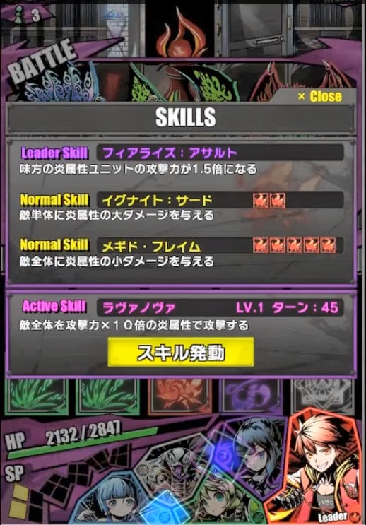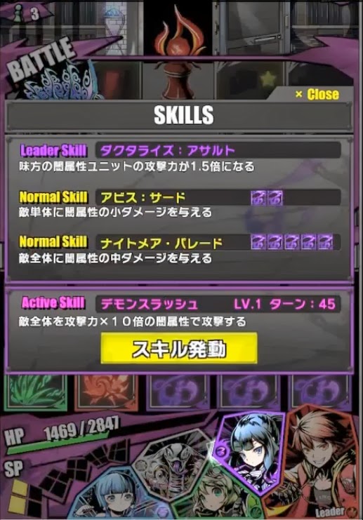 技能冷却回合需至0,才可以点撃角色头像,按「スキル発动」使用。角色每移动一格,及战斗中每过一回合,技能的冷却回合都会减一。有效平衡战斗及移动,「储Turn」,进入Boss战时,便可以一鼓作气发动主动技以给予敌人头目大伤害。
