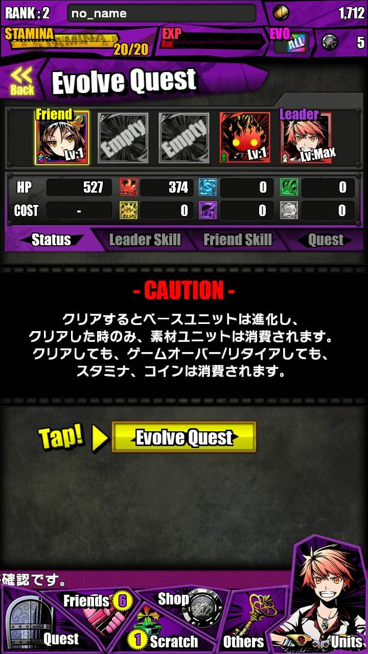 等级升满后,教学会带玩家去Evolve(强化) 介面,同大部分相类游戏一样,玩家要集齐特定的进化素材。集齐素材后,居然会到了一个名为Evolve Quest介面(进化任务)。不错,玩家就是要带着要进化的角色,素材,及朋友去完成任务,才可以进化。Evolve Quest内的玩法跟之前行迷宫开门一样。不过完成后,那名Leader角色会进化。要注意的是,不论任务是否成功,素材都会消失。此刻没有强劲朋友的话,真是会到连进化也进不了的绝境。