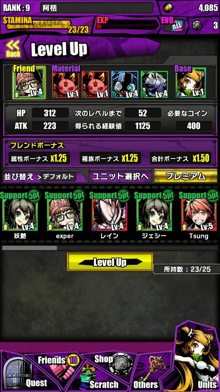 完成首个关卡后,系统会教玩家强化(Level Up)。一如其他游戏一样,玩家进入强化介面,点选想要升级的角色(Base)及最多4个素材(Material)。有趣的是,吃掉的素材属性与Base是否相同,并不影响经验值多少,即木属性角色吃 Lv1 火兔仔,跟 火属性角色吃Lv1 火兔仔 都是同样得 75 Exp。那要怎样才可以增加获得的EXP呢?答案居然是靠朋友,看来官方有心利用此系统来增加玩家之间的互动。