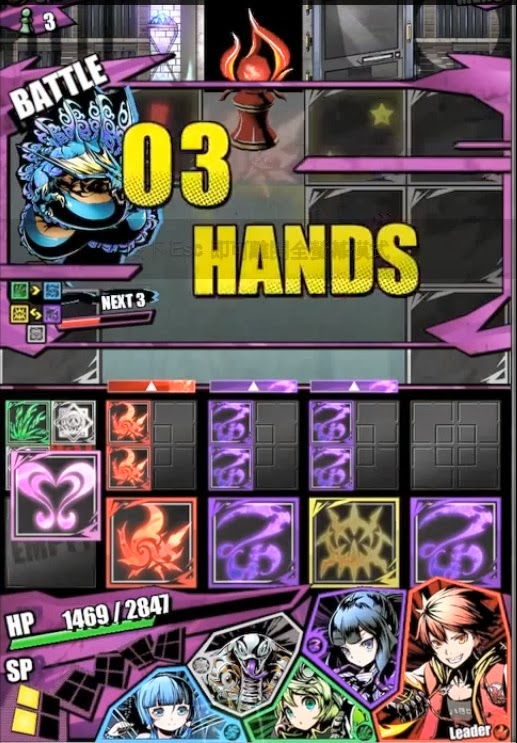 以上图两名角色因为例,下图的攻撃次数有3,分别是炎属主角1撃的「イグナイト:サード」及暗属女角2撃「アビス:サード」。而左手的格子因为得不到特定组合是作废论。不过玩家需不时利用这些空格子,把没有用的方块掉弃。 03 HANDS 即是3回技能发动之意。