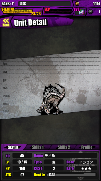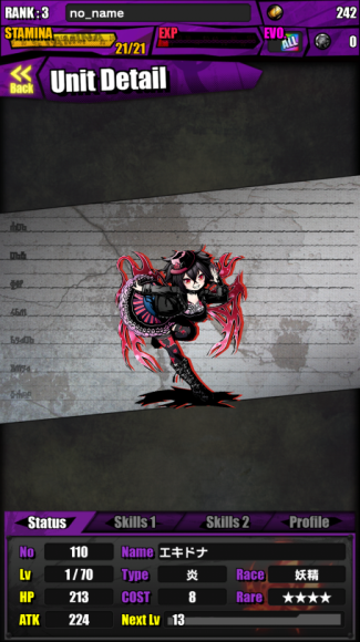 主动skill: 对敌方单体造成自身攻击力1倍的伤害,并回復相当于伤害100%的HP (Skill Lv.1 – CD 15)