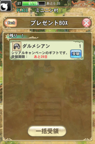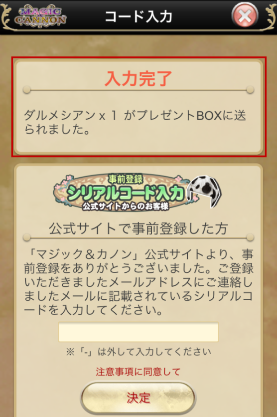 6. 成功的话, 就可以看到下面讯息「入力完了」, 虽然讯息上是说, 已经送到礼物盒了, 可是我是把程式关闭后, 重新进入游戏, 才看到东西在礼物盒裡面。