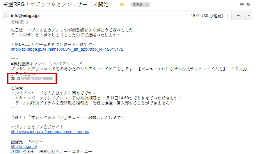 1. 首先你需要先参加过【事前登录】的活动, 我是用 Gmail 去申请的, 下面是收到的活动通知~!红框的12码数字, 就是游戏中要拿来领取奖励的序号。