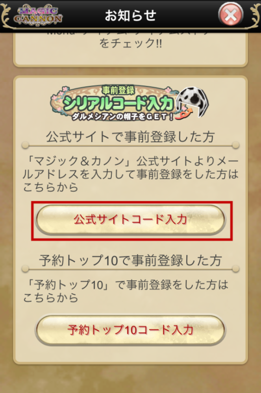 4. 在官方的活动公告页面, 往上滑动, 下方会出现「事前登录」的活动讯息, 点选「公式サイトコード入力」的按钮。