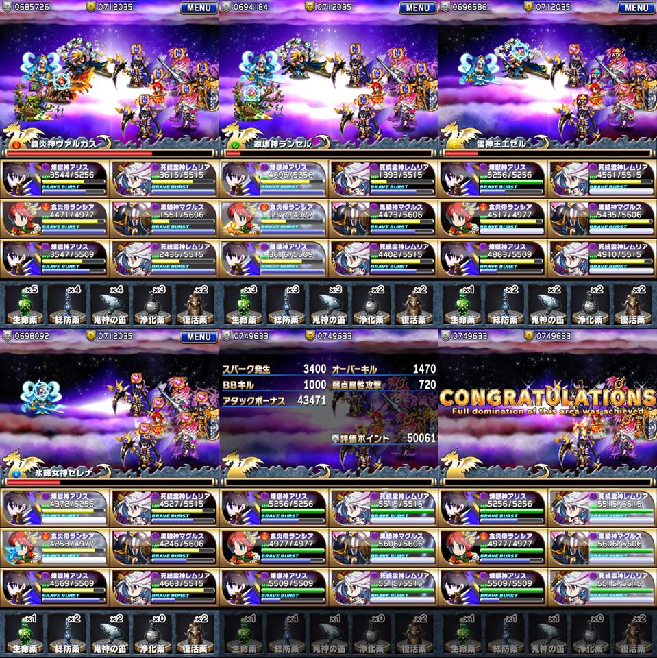 血不够时,除了补师/鬼神の笛/生命药,适当的时候也请善用防御来配合,20关之前完全不吃総防薬和鬼神の笛~,到30关前総防薬和鬼神の笛最好有4个或以上,技能使用方面~以我队伍为例,我会尽量调整到下一个回合前BBMAX,食炎帝没BBMAX时,5位攻击手就要BBMAX。塬因在于可以尽快在下一个回合杀敌减少伤害外,技能HIT数较多再加上SPARK效果,再配合鬼神の笛后HC和BC的掉落量相当可观,可以尽快再次BBMAX和减低之后2~3个回合的道具消耗。