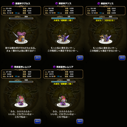 闇队刚使用一星期多,除了炼狱神之外其他人物的特徵都不是很熟识,在这几天做任务和PVP的对战中,发现闇主黒骑神的回復值虽然很低,BB却可以回得很快(和勇者アルマ类同…BB BAR比正常人物短?)而死统霊的技能除了有机会中毒之外,当两隻同时普攻+SPARK所打出来的BC.HC量相当不错,经过思考后…重组的队伍中果断放弃一隻攻击型炼狱神。