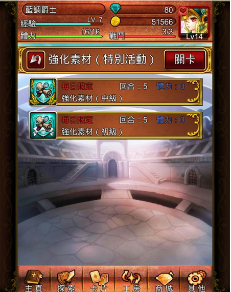 而经验值的取得除了从副本中得到之外,也可以从活动中取得。在强化素材这个活动当中,由于是每次限定次数,所以并不会消耗体力,当我们快要升级的时候,就不要来打这个活动,把它留到没体力时再来进行,才不会白白浪费一次探索的机会。