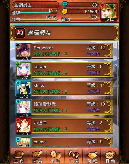 一般来说,队长这个位置,都会放最强的那张卡牌,玩家在这部份要多花点心思来查看每张卡牌的队长技能。在初期如果可以的话,还是尽量冲高输出攻击,在进行副本时就一路辗过去就行了。另外要特别注意的是,我们也可以设定一张卡片,做为别人的战友,这张卡片可不要随便乱选喔!因为如果我们放了一张烂卡,那就会影响到别人选我们做战友,那自然也就减少了互加好友的空间了,所以当你发现好一阵子没人加你好友时,可以看看是不是自己的战友牌不符合市场需求啰!