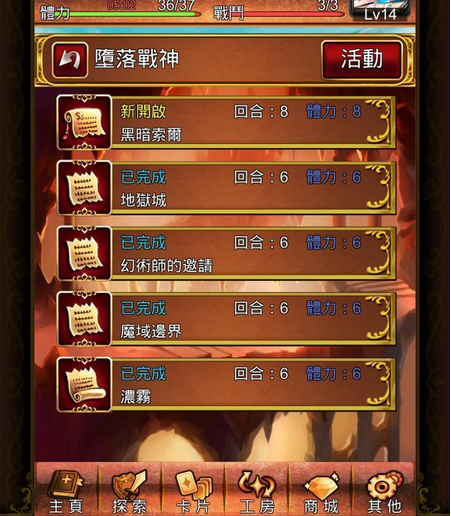 游戏在初期升级是件非常容易的事,通常打个一、两场战斗就会升级了,而每次升级时体力都会补到全满。这时候我们有一个非常重要的观念,千万要记住!体力值要有效的运用。在初期的剧情副本探索,除了第一关是消耗体力值3 之外,其余每个关卡会消耗体力值5 ,消耗的体力值就代表着这一关的回合数。