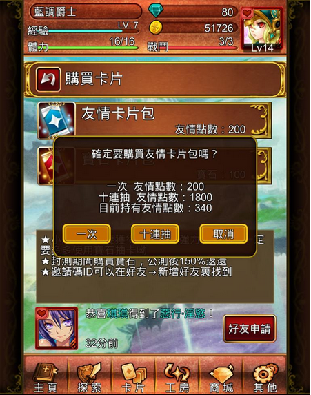 《口袋战姬》虽然在大部份时候,玩家会觉得像是在玩单机游戏一样,没有办法和其他玩家互动,但是在游戏中,「好友」可是非常重要的一个环节喔!我们在商城中,可以利用「友情点数」来购买卡片,这对于不想花台币但又想拿到高等卡片的人来说,是一个绝对不可以错过的管道呢!
