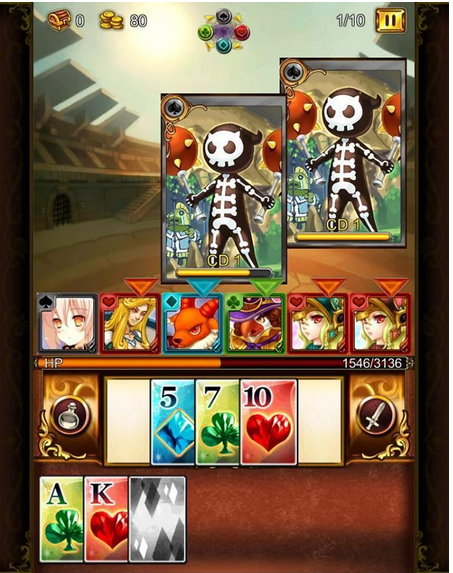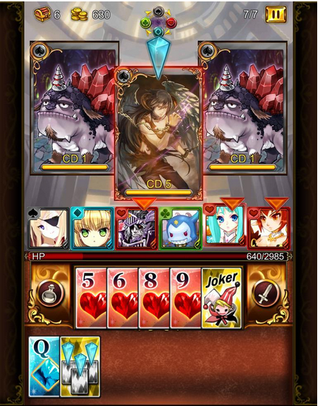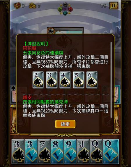 在战斗的过程中,我们是利用扑克牌「大老二」的玩法来进行攻击,出牌的顺序、策略,这部份会另外开辟专栏来说明,在这里笔者要特别说明的就是鬼牌。游戏中鬼牌可以当做任何牌,系统会帮你自配认定最好的组合而当成最好的牌,但是如果是用鬼牌凑到铁支,会导致没办法四属都输出,所以伤害会差非常多,除了同花顺以外,其余用鬼牌凑牌都会有这情形,只是铁支特别明显。也就是说,鬼牌只是帮助我们容易凑成牌组,但实质的威力还是输给真正的牌组喔!