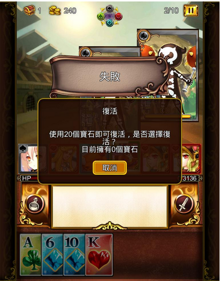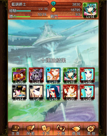 在游戏进行的过程中,我们会有很长的时间在副本闯关的部份,这里也是我们最主要取得经验值来源的地方,所以玩家们在这个部份可要好好着磨一下才行喔!我们每通过一个副本,就可以领到20 个宝石,宝石最大的用处就是它可以用来购买卡片,而且抽到高级卡片的机率相当高。