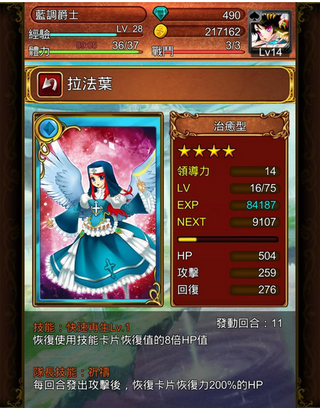 战斗中的回复方式分成两种,一种是将手牌往左滑制造属性回复,这时候如果我们丢的是方块牌,那就只有方块属性的牌会帮忙补血,所以丢手牌回血时尽量丢牌组里面回复能力最强的那种花色,会补得比较多;另一种则是使用队长技能,在出手之后补血,说到这里就不得不提两位很常被拿来当队长的治愈型卡片,分别是大天使拉法叶以及比较容易取得的四星花仙.紫罗兰。