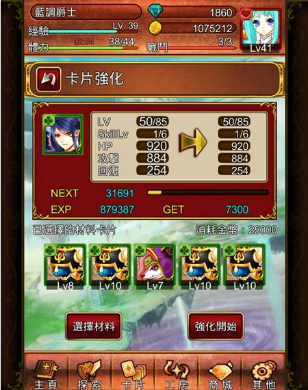在游戏中,卡片要提升等级只有一个方法,那就是透过「卡片强化」。将我们再要培育的卡片选入,再放至1~5 张要用来强化的卡片,并支付部份的金币,就可以进行强化了。过程就是这么简单,但是其中的要诀就不是那么容易啰!