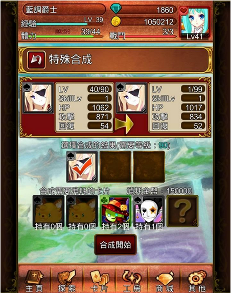 通常只有一种选择的卡片,本身就属于高等级的特殊卡了,这种卡片要进行特殊合成的难度比较高,除了卡片本身的等级需求较高之外,要投入的「合成用卡片」也较难取得,花费的金币也较高,但是相对的一旦合成功,那卡片的威力简直是不同凡响呀!那拥有叁种特殊合成选择的卡片,也不代表就是烂卡,我们要知道领导力在这游戏来说是非常重要的,在50级之前,我们很难排出全部五星以上的阵容,势必得夹杂着一些二星、叁星的卡片,但是部份的二星、叁星卡片又不容易从关卡当中取得,这时候特殊合成就是一个非常好的管道啦!