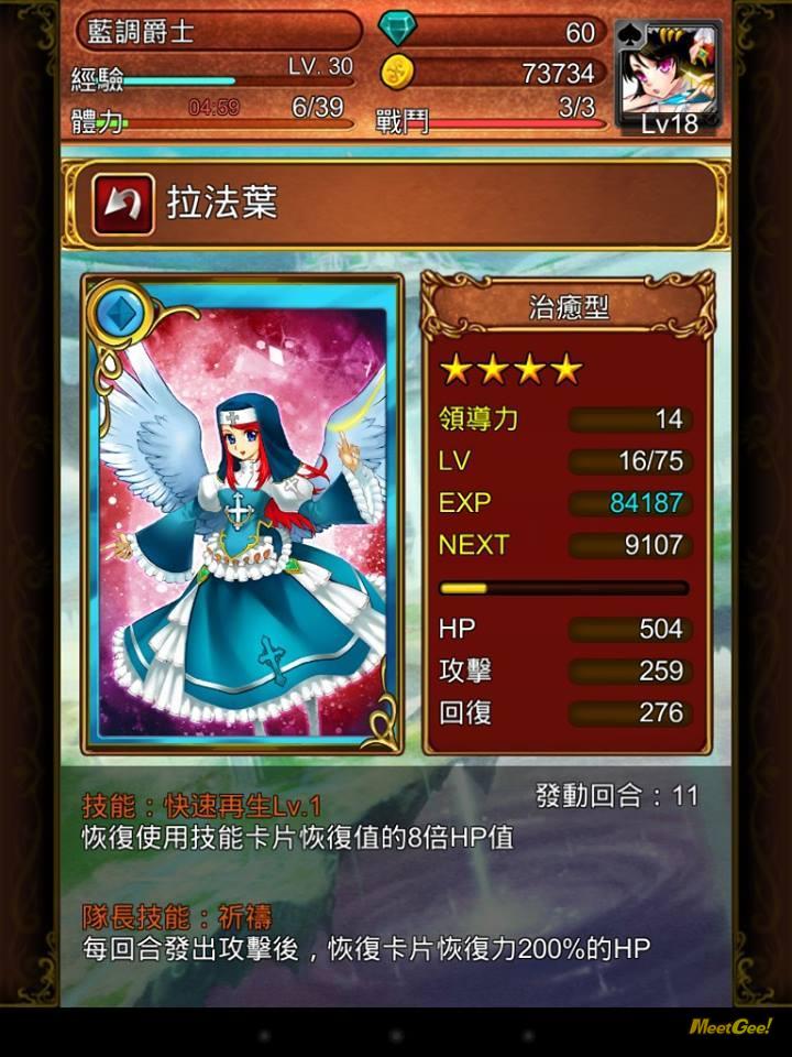简单说,这就是一支持久队,队员以治疗类居多,输出值是惨不忍睹的低,但是HP可以轻鬆突破10,000滴,如果回復数值高,回一次血大概在4000上下,至少也会有2000滴回血量的成效,这种队型就是专门用来打回血战的。因为回合数撑得够久,所以要洗出好的扑克牌牌组非常容易,不容易灭团,但是时间会耗的很久。建议这种队伍裡面,最好还是插一张具有指定类伤害技能的卡片,像是对爱心产生大量伤害的这种技能,这样子在打BOSS跟前置关卡时,会比较好进行。
