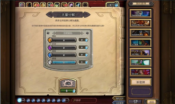 在右侧「我的套牌」中,将会列出玩家目前所自订的英雄牌组,玩家们也可以点选「新套牌」来创建一副新的英雄自订牌组,在自订时也可以使用系统推荐的卡牌来配置,或是选择好部份卡牌后,由系统帮忙挑选组成一副完整套牌,创建好的牌组也可以取自己想要的名子,功能非常完善,不论何种程度的玩家都相当受用。