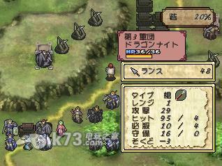 用陨石给龙骑来一下,罗珐尔上去替他换上阳炎。然后拉菲恩用94斩铁枪攻击龙骑,由于必杀率接近50%,且可追击,出必杀的机率很高,而龙骑的剩余HP不足以承受一次必杀,所以只要不是很RP都是可以解决他的。实在不行就Load,反正才第一回合么。注意拉菲恩的出场位置一定得是在龙骑正下方第五格处,这个位置离龙骑最近,这样杀死他后可以再移动到这个位置