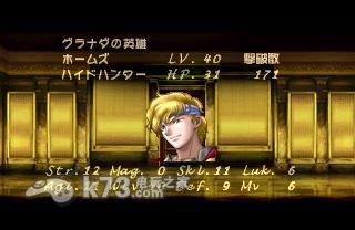 | 简单。杂兵就不说了,最后的老将军因为有大盾,所以要先以魔法攻击,两次奇迹之风(舞娘配合)+一次初级雷,HP降到5,然后罗杰持细剑一招死生之技(预先将HP减至个位数),不管你出不出大盾都要败呀。老将军数值真不错,继罗珐尔之后,我军又添一猛将,可喜可贺~